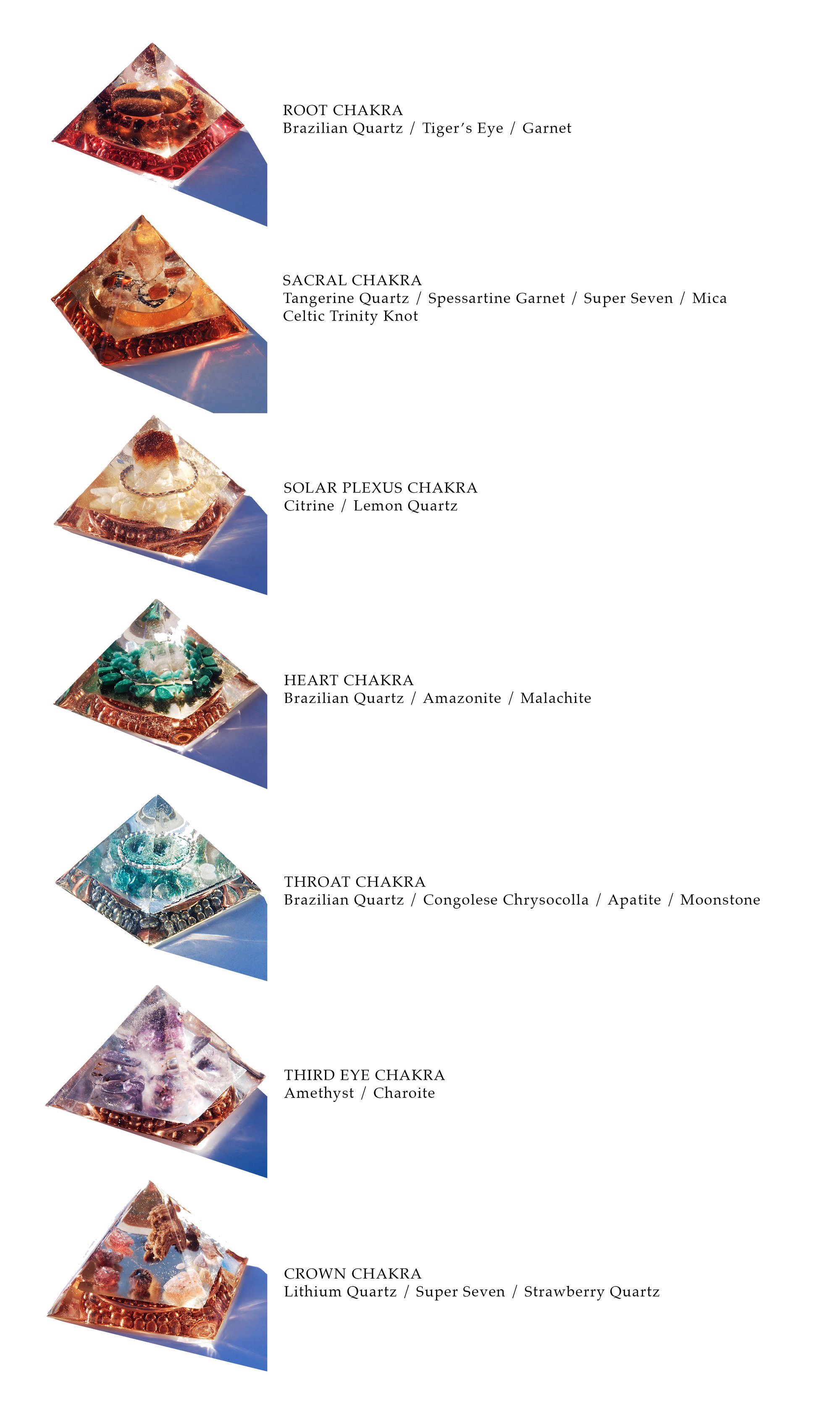 CHAKRA PYRAMID SET - This set includes 7 small pyramids with stones and colors coordinated to the 7 chakra systems in the body. When used base to skin directly on the body, the orgone vortex can activate, enhance, balance and initiate chakra spin correction. Crystal information for each pyramid included. Limited availability.